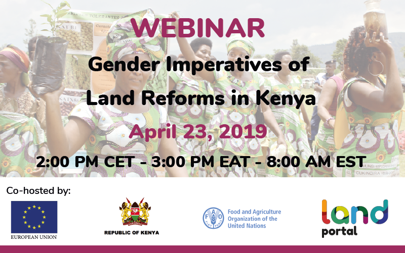 You are invited to join the webinar on the Gender Imperatives of Land Reforms in Kenya(link is external) on 23 April, from 3 PM to 4:30 PM EAT (2 PM CET / 8 AM ET) to discuss these issues.